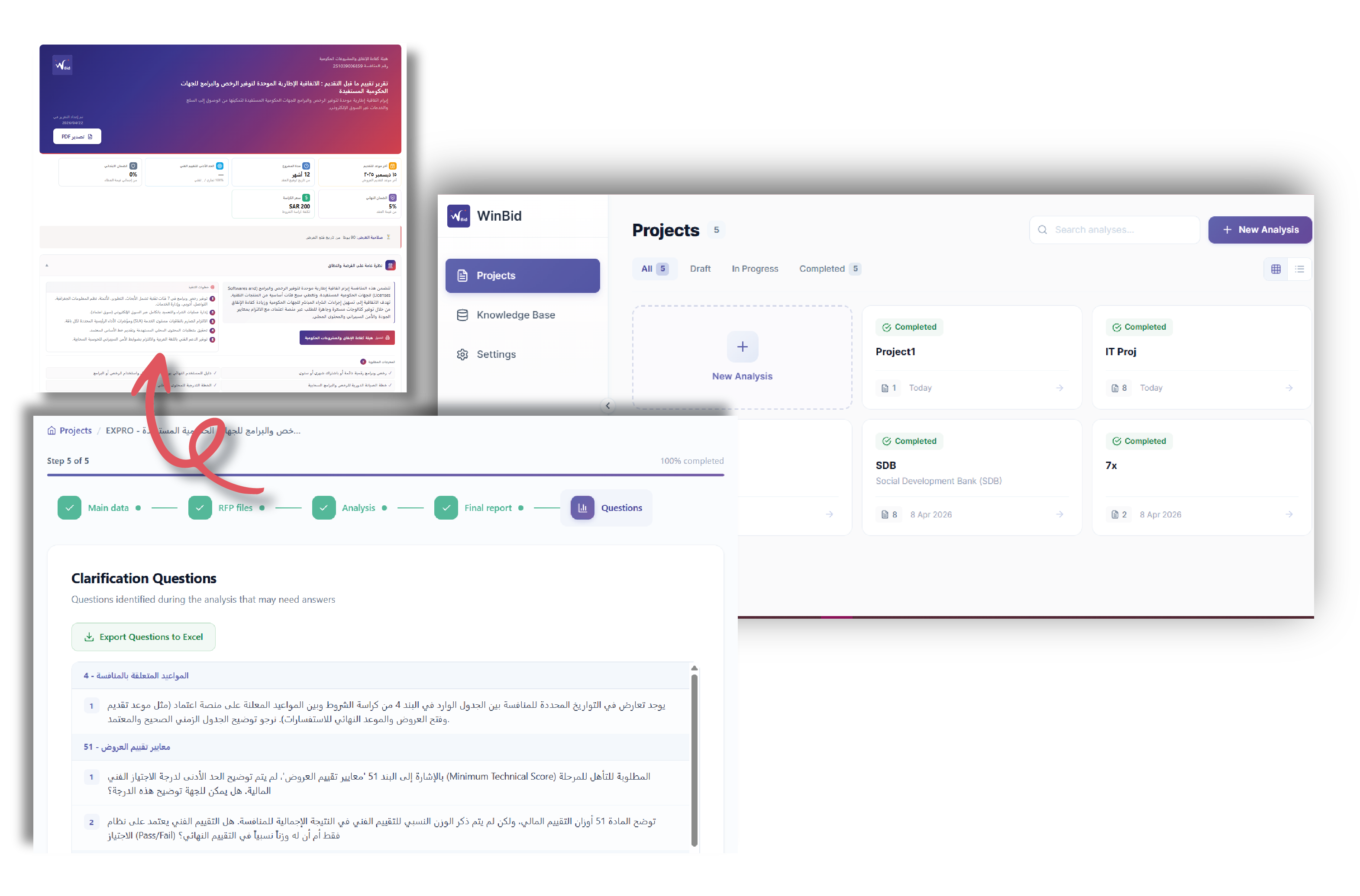 يُنشئ «WinBid» تلقائيًا ملف Excel قابلًا للتصدير يحتوي على أسئلة استيضاحية دقيقة، مع ربطها المباشر بأقسام المستند، أرقام الصفحات، والنصوص ذات الصلة، مما يعزز دقة المراجعة وسرعة التفاعل