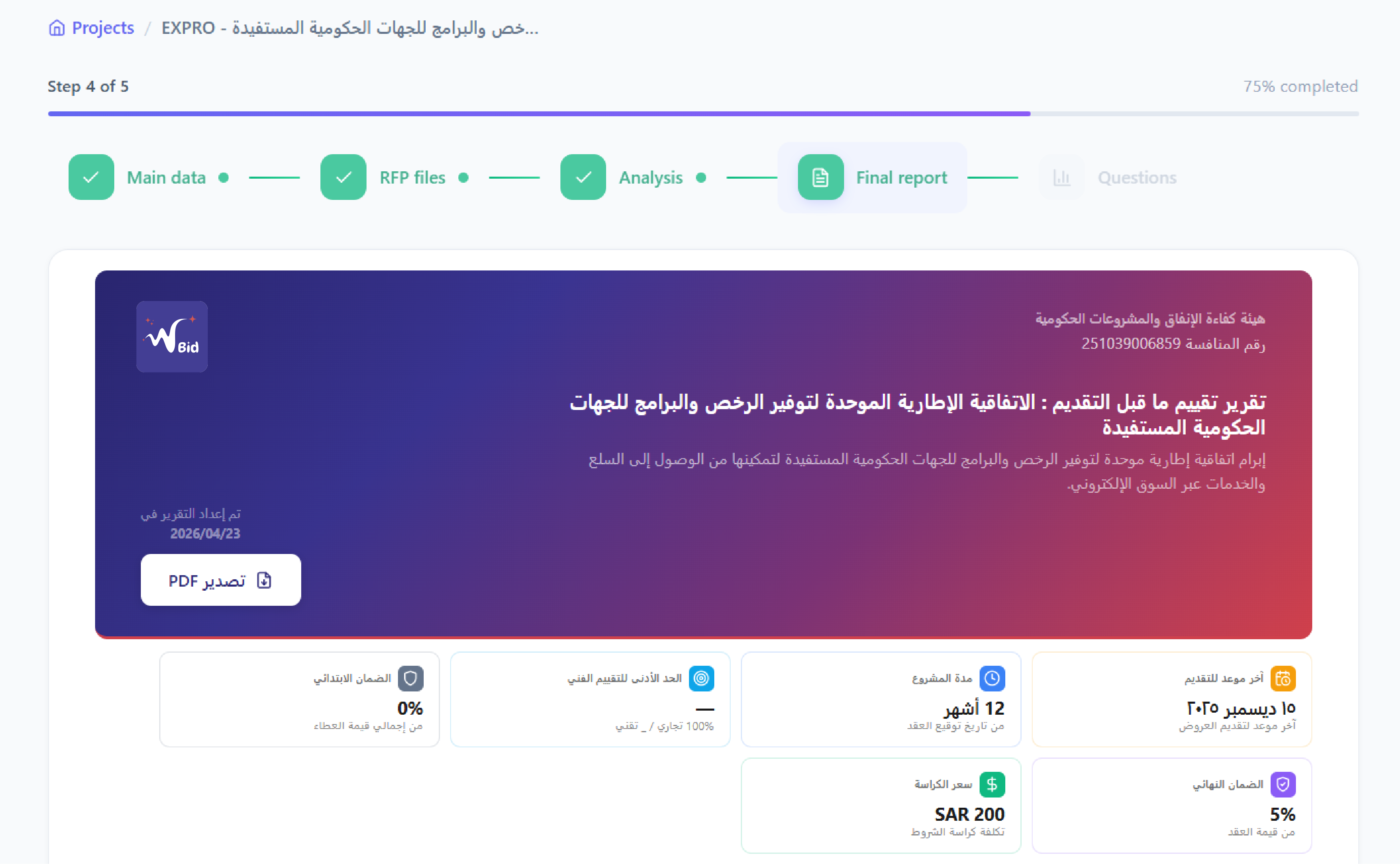 أنشئ مشروعًا جديدًا لتقييم كراسات الشروط وابدأ عملية التحليل المدعومة بالذكاء الاصطناعي